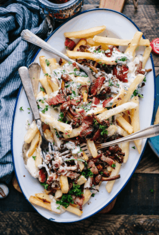 SPINACH, MUSHROOM + BACON ALFREDO POUTINE