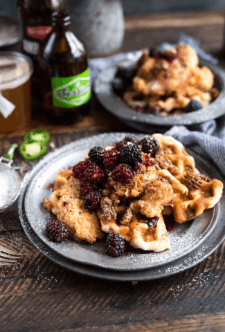 CHICKEN + WAFFLES WITH BLUEBERRY SYRUP