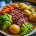 A hearty dish of corned beef and cabbage cooked slowly in a crockpot for rich flavors.