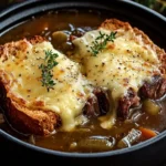 - 8️⃣Prepare the toast:Preheat the oven to 425°F (220°C). Arrange the French bread slices on a baking sheet and toast for 10 minutes, or until dry and slightly crisp.9️⃣Add the cheese:Switch the oven to broil. Top each slice of bread with shredded Gruyère cheese and broil for 2-3 minutes, until the cheese is melted and bubbly.🔟Serve:Ladle the rich soup into bowls. Top each serving with a slice of Gruyère toast. Garnish with black pepper and fresh thyme. Serve hot and enjoy!