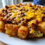 A hearty breakfast casserole featuring crispy tater tots, eggs, sausage, and cheese.