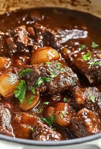 - Stir in the tomato paste and cook until darkened, about 1-2 minutes. Sprinkle with the flour, stir to coat, and cook for 1 minute to eliminate the raw taste.6️⃣Deglaze and Simmer:Pour in the red wine, scraping up any browned bits from the bottom of the pot. Add the beef broth, thyme, bay leaves, and 1/2 tsp kosher salt.Return the beef, turkey bacon, and any accumulated juices to the pot. Stir to combine and bring to a simmer over medium-high heat.7️⃣Bake:Cover the pot with a tight-fitting lid and transfer to the oven. Cook for about 2 hours, until the beef is fork-tender.8️⃣Cook Onions and Mushrooms:About 30 minutes before the beef is ready, melt the butter in a skillet over medium heat.Add the pearl onions, mushrooms, 1/2 tsp kosher salt, and 1/4 tsp black pepper. Cook, stirring occasionally, until tender and lightly browned, 12-15 minutes.9️⃣Finish the Stew:Remove the pot from the oven and discard the bay leaves and thyme stems.Stir in the cooked onions and mushrooms. Taste and adjust seasoning with more salt and pepper if needed.🔟Serve:Garnish with chopped parsley if desired. Serve hot over egg noodles, mashed potatoes, or alongside crusty bread.
